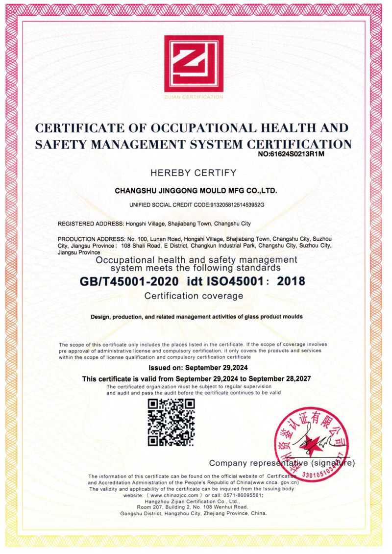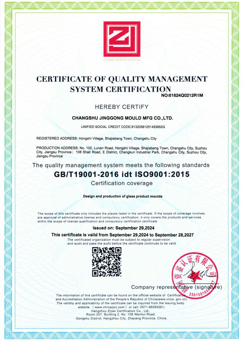 Jinggong Mould has been honored with numerous accolades, such as China’s Top-Quality Product Certification, Best Supplier Award from Huaxing Glass Group, Meritorious Enterprise in China’s Daily-Use Glass Industry, National Torch Program High-Tech Enterprise, National "Specialized, Refinement, Differential and Innovation" Little Giant Enterprise, Jiangsu Province Service-Oriented Manufacturing Demonstration Enterprise, Jiangsu Province Green Manufacturing Factory, Jiangsu Province Intelligent Manufacturing Demonstration Workshop, Jiangsu Province Four-Star Cloud-Based Enterprise and Jiangsu Province Industrial Internet Benchmark Enterprise, underscoring our leadership in innovation and sustainability.